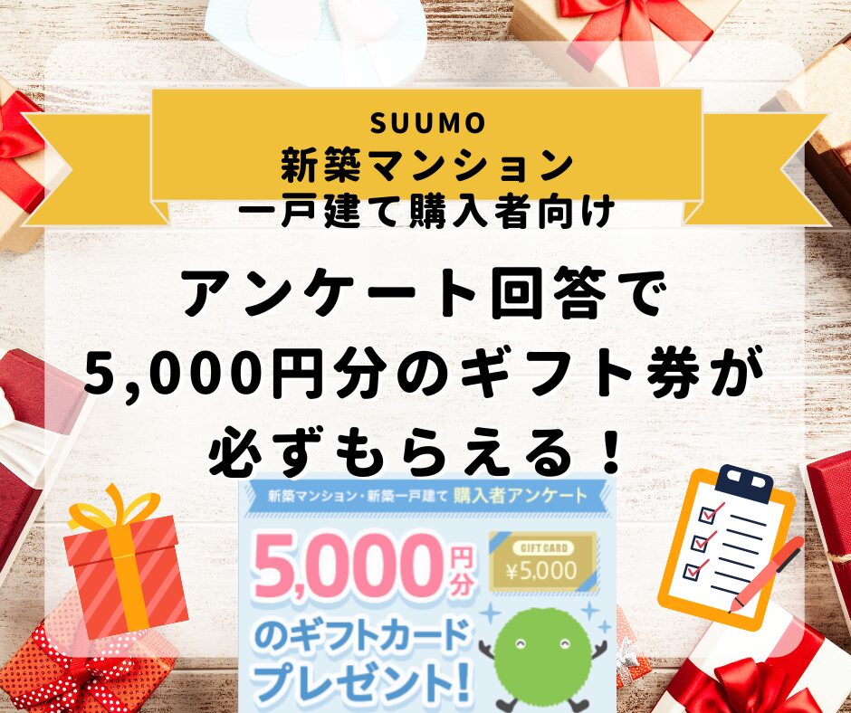 住宅情報サイト「SUUMO(スーモ)」が、新築マンション・新築一戸建てを購入した方を対象に回答者全員へ5,000円分のギフト券がもらえるアンケートキャンペーンを実施中です。